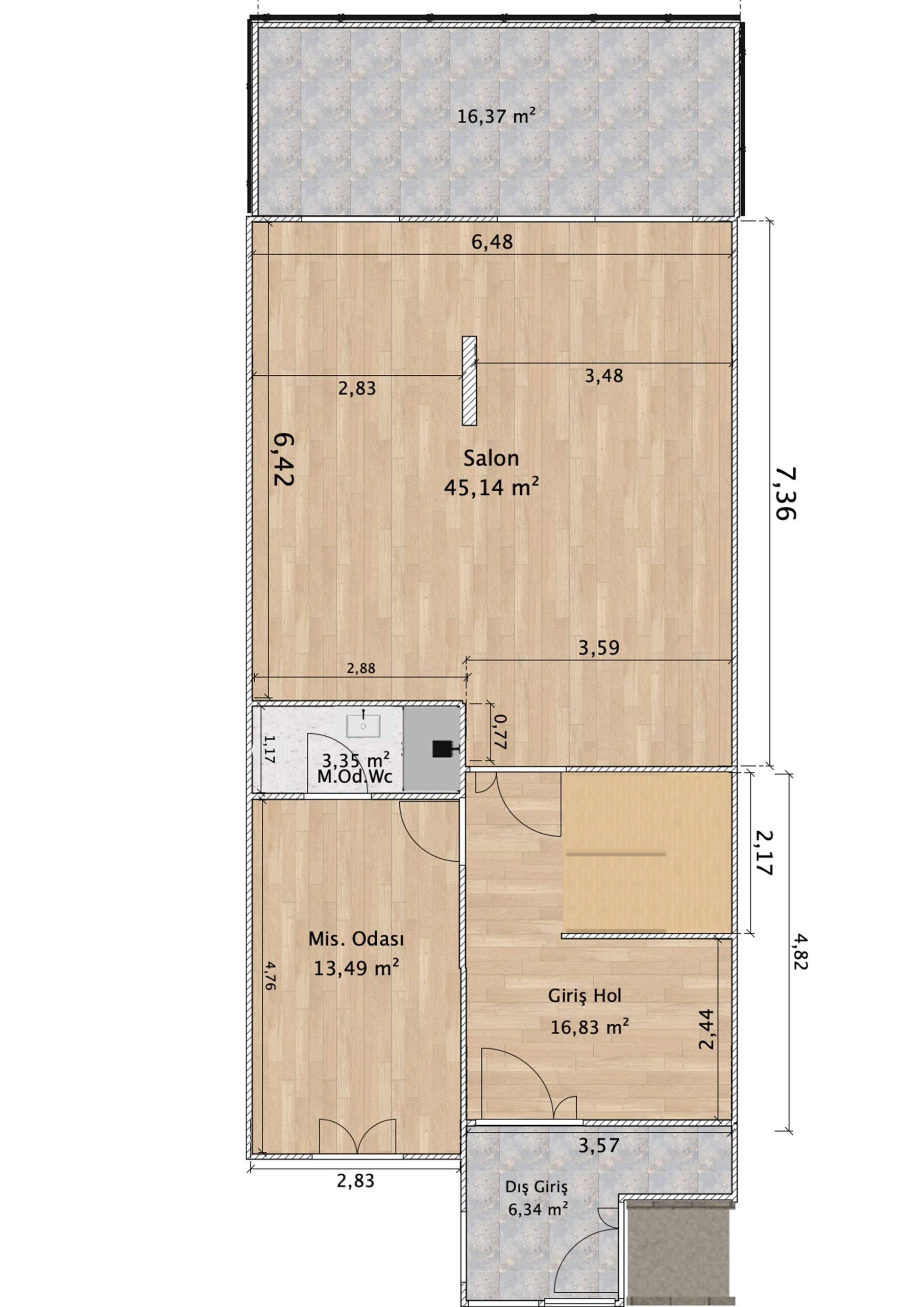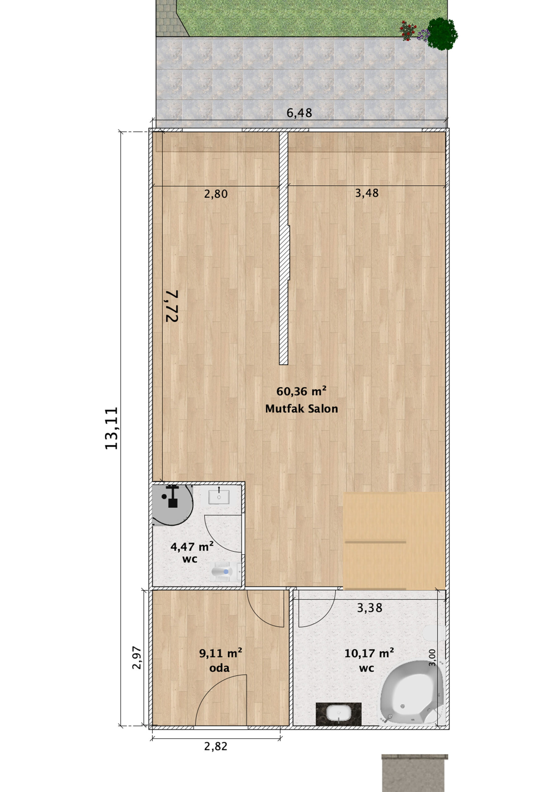 Garden Level (‑1): 84.11 m² net / 149.11 m² gross (50 m² garden + 15 m² terrace). A spacious kitchen and living area separated by an island (60.36 m²), two WC facilities (4.47 m² and 10.17 m²), one bedroom (9.11 m²) and a laundry room are on this level. A jacuzzi bathroom and traditional Turkish WC complement this floor, which opens directly onto the veranda and private garden.